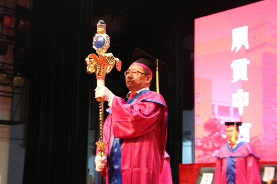 中午15:00整,经理刘中华教授执太阳城博彩权杖,与14位主礼教授入场。庄严肃穆的国歌声响彻会场。