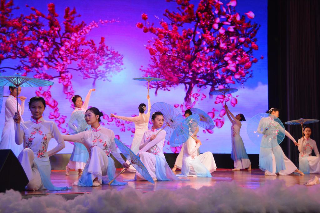 紧接着民舞队用舞蹈演绎歌曲《凉凉》,幽婉的歌声中,舞者一颦一蹙尽显古典美,使台下观众仿佛也置身那片桃林仙境。一曲舞毕,仍让人意犹未尽。