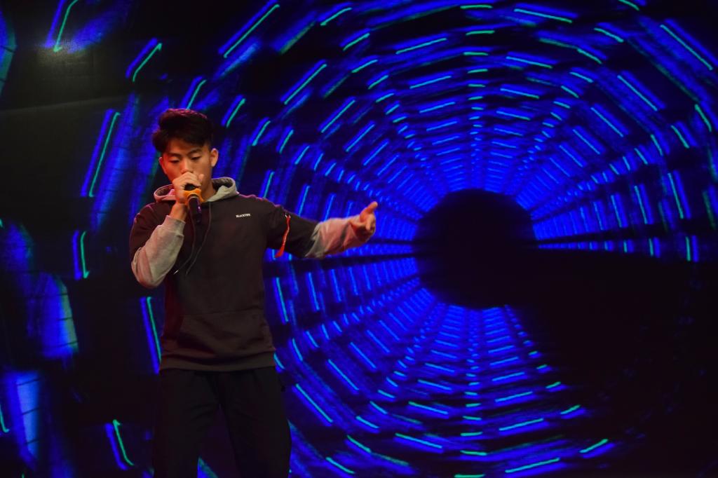 其后,蒋后铖极富激情的Beatbox表演《节奏魔术师》中,虽只有一人一话筒,却发出数种变化莫测的声音,用动感十足的节拍,诠释着节奏的魅力,让全场充满惊叹与激情。