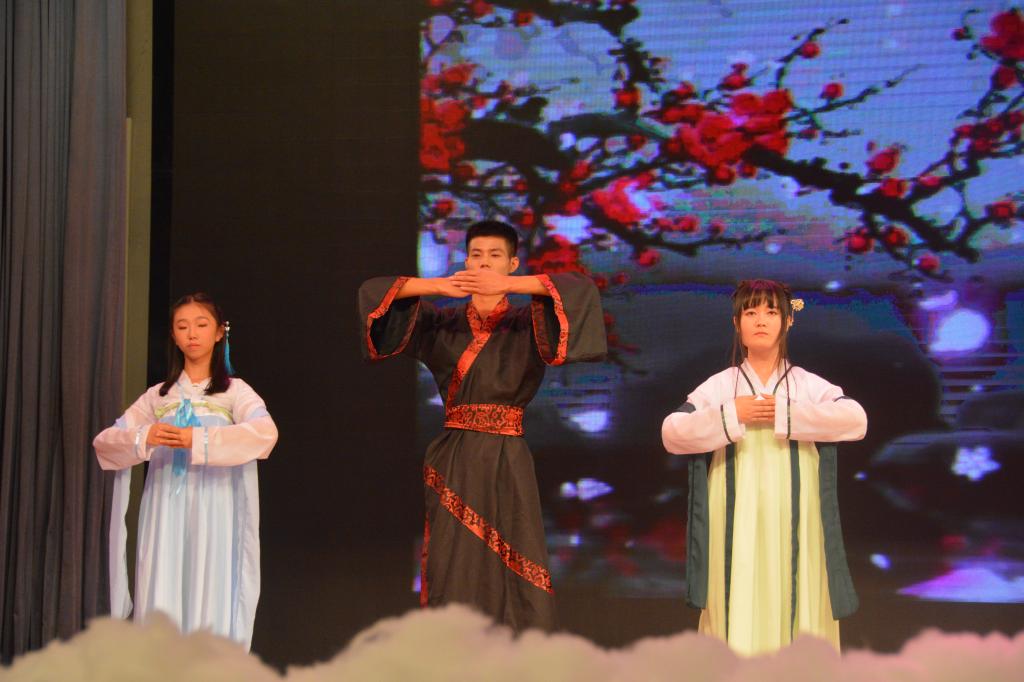 接着由1704和1706班带来的话剧《与子同袍》中,演员们以老员工生活中的场景,演绎汉服爱好者所遇到的种种尴尬,将观众带入由汉服引起的文化忧思,并且在剧末向观众们展示精美典雅的汉服,让人在感叹和赞赏中不禁肃然起敬。