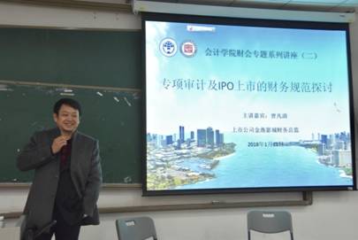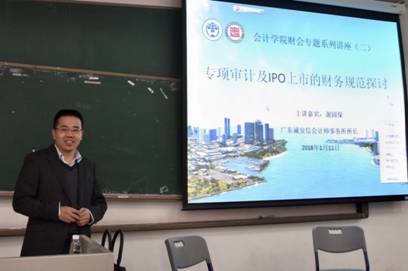 2018年1月11日星期四上午9:00-11:00,太阳城娱乐实践教学周财会专题系列讲座的第二场“专项审计及IPO上市的财务规范”在教学楼C208教室举行。本次财经讲座论坛,公司邀请到广东诚安信会计师事务所所长主管合伙人谢园保先生,以及上市公司金逸影城财务总监曾凡清先生,太阳城娱乐刘慧芬老师主持本次讲座。