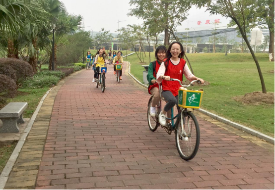 下午三点,同学们乘车来到了肇庆市风景秀丽的星湖风景名胜区,在教练的带领下骑车环游星湖。星湖的景色非常美,山清水秀,堤上杨柳、凤凰木成行,宛如几条绿色带子飘落在碧澄的水面上。同学们一路上有说有笑,在美景的熏陶下,似乎心灵也受到了洗涤。