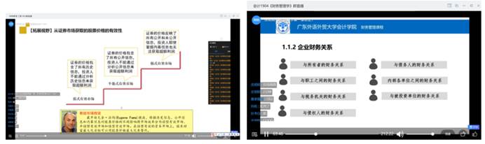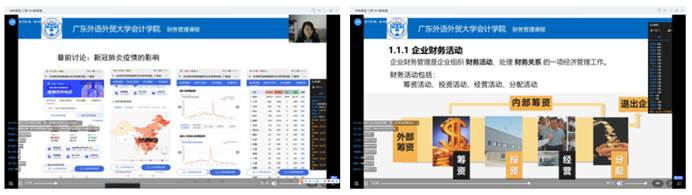 《财务管理学》课程组负责人龙文滨教授与任课教师庄明明、教学助理江烁楠、柯依辰对现有热门在线教学平台,如雨课堂、腾讯会议、QQ会议、钉钉课堂等,进行逐一测试,记录在线教学过程中是否卡顿、能否互动、在线测试、签到考勤等事项,并结合本门课程的授课特点进行了筛选,最终选定使用钉钉课堂进行在线教学,并使用启课程平台进行签到、预习和课堂互动。