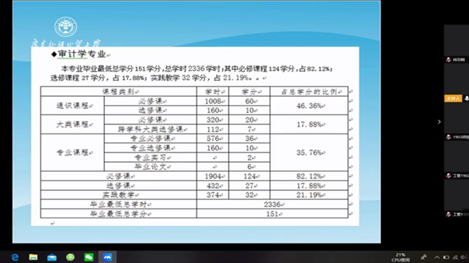 2019年,审计学专业取得了广东省一流专业建设点。审计系主任黄浩结合疫情防控讲解审计学领域的理论知识体系和实务案例,他指出无论是对信息的处理与披露(会计)、对信息的使用与决策支持(财管),还是对信息的验证监督与风险控制(审计),三个专业并无明确分界,都需要拓宽知识面,大力培养自主学习能力,提高自身对社会信息的敏锐度、逻辑推理能力、以及职业判断能力。他进一步对审计专业特色、团队力量、教学计划等进行了全面介绍,他强调了跨学科跨专业学习对提升综合素质的重要意义。