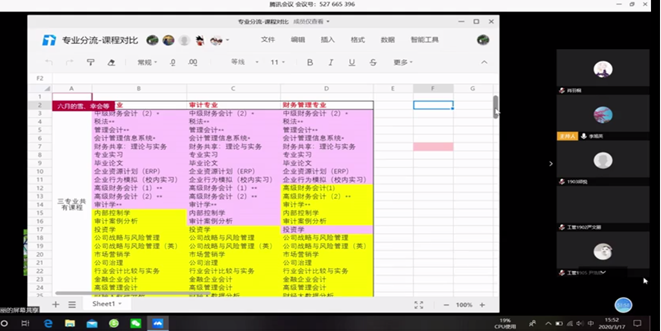 2020年3月17日下午,太阳城娱乐利用腾讯会议在线召开了2019级本科员工专业分流大会,会议对2019级专业分流进行了方案讲解和专业介绍。太阳城娱乐副经理蒋基路、党委副书记杜焕君、系主任张瑞丽(会计)、龙文滨(财务管理)、黄浩(审计)、辅导员周雅颂、陈瑶、教务办李旭英老师,2016级毕业班优秀学长陈楚倩、陈伊诺、张俊倪,以及大部分2019级本科生参加了此次交流会。会议持续三个小时,腾讯会议室参会人数300人始终满员。