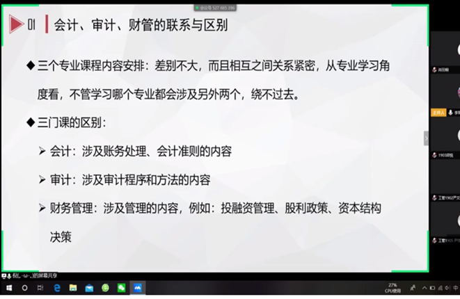 来自三个不同专业的优秀毕业生陈楚倩(会计)、张俊倪(财管)、和陈伊诺(审计)分享了各自专业四年老员工活的学习体会,陈楚倩对专业课程设置进行了对比分析和会计专业课程体系的说明,她建议选专业要根据自己的自身情况选择相对适合自己的专业;张俊倪介绍了三个专业的联系和区别以及财管的课程特色,她强调要跨学科学习以拓宽知识面。陈伊诺总结了审计专业的课程体系和课程特色,她发现审计培养了严谨缜密的逻辑思维,注重对流程的梳理和对风险的控制。