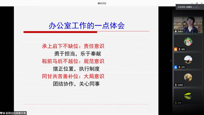 袁薇佳围绕公文要素、公司常用公文文种写作、讲话稿写作等内容,通过生动鲜活的写作案例分析以及公文处理工作方面的一些应用技巧与参会人员进行了分享,强调办公室工作要做到“承上启下不缺位,增强责任意识;鞍前马后不越位,增强规范意识;同甘共苦善补位,增强大局意识。”