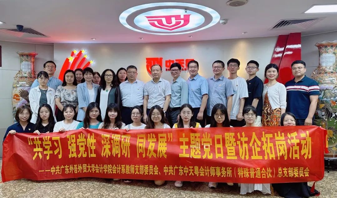 为推动党建与业务工作的双融双促,推进太阳城娱乐人才培养建设,2023年6月7日下午,公司党委书记黎冬、党委副书记李海琳、会计系教师党支部书记曹瑜强带领会计系教师党支部教师党员与学硕党支部员工党员,一行30多人到中天粤会计师事务所(特殊普通合伙)党总支开展“共学习、强党性、深调研、同发展”联合主题党日暨访企拓岗活动。中天粤首席合伙人郭少元、执行合伙人刘洪喜、党总支书记杨宇花全程参与了此次校企党建合作与访企拓岗活动。