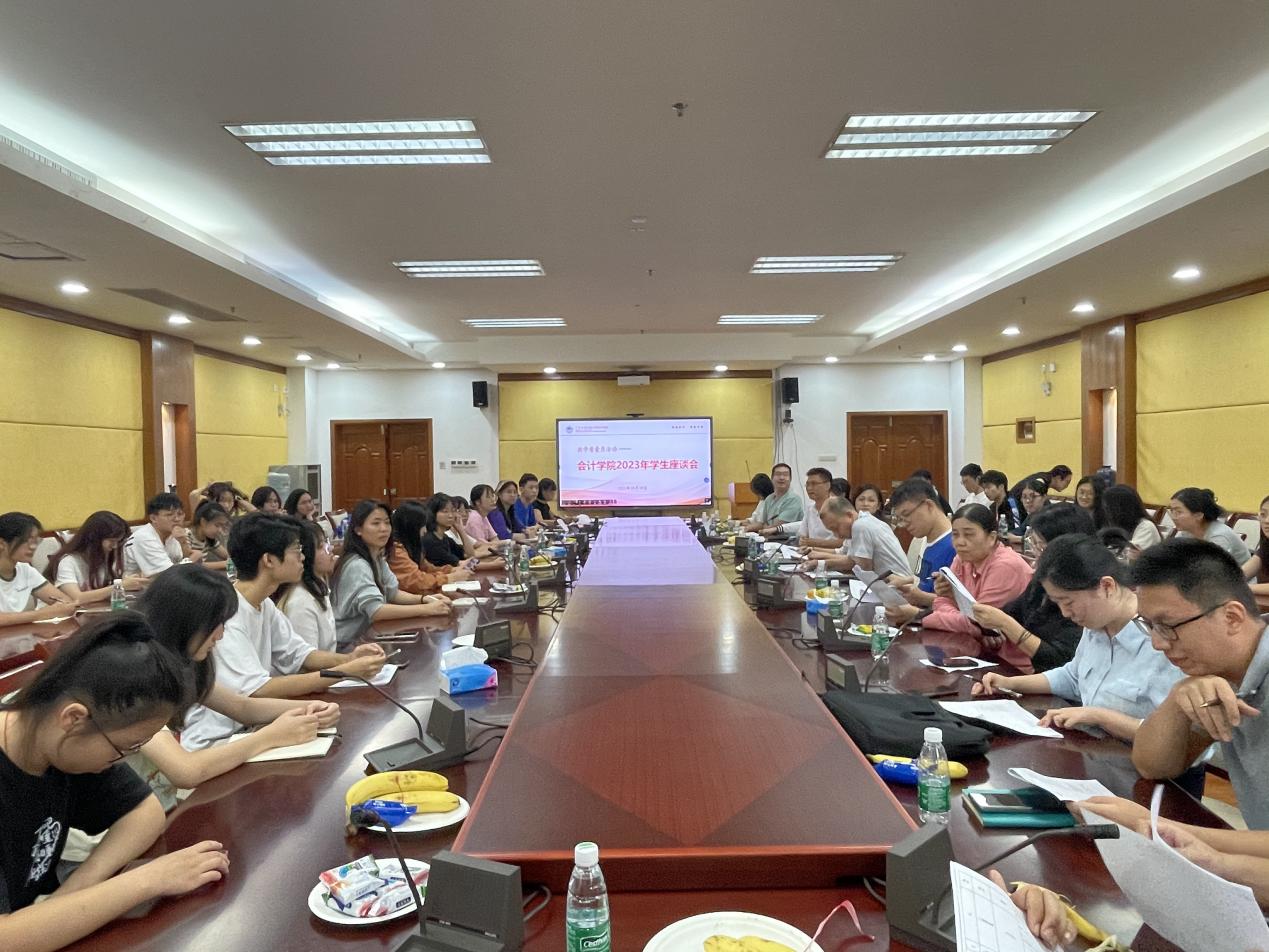 接下来举行了员工座谈会,党委书记黎冬、党委副书记李海琳、副经理黄浩、龙文滨以及会计系主任曹瑜强、审计系主任钟子英、财务管理系主任许红梅、ACCA项目主任常亮以及CIMA项目主任苏力、国创项目主任孙黎、全体辅导员、教务办老师和各班级的员工代表出席了本次会议。